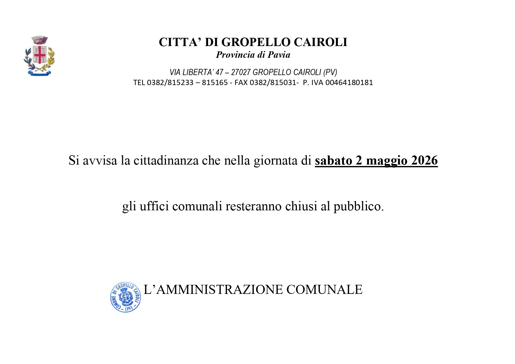 Avviso alla cittadinanza; chiusura uffici comunali giovedì 23 aprile 2026.